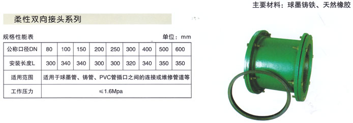 柔性雙向接頭適用范圍:適用于球墨管、鑄管、PVC管兩插口之間的連接或維修管道等。