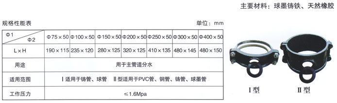 分水卡子用于主管道嫁接分支管道。主要材料:球墨鑄鐵, 橡膠。適用管道:國標(biāo)球墨管,鑄鐵管,國標(biāo)PVC管,PE管。工作壓力:≤1.6MPa。